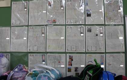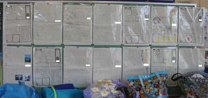 夏休みにあったことを新聞形式で書いています。写真を入れたり、見出しやイラストなどのレイアウトを工夫したり、さすが6年生だなと感心する作品がたくさんありました。