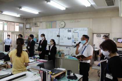 今日の全校朝会では、今日から来られる先生や教育実習生の紹介をしました。
