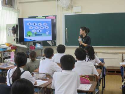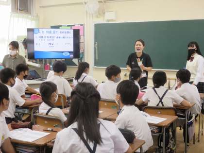 今日は、金剛学園の先生方と生徒の皆さんに来ていただき、6年生に『韓国の文化にふれよう』をめあてに、ハングルとテコンドーを教えてもらいました。