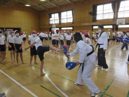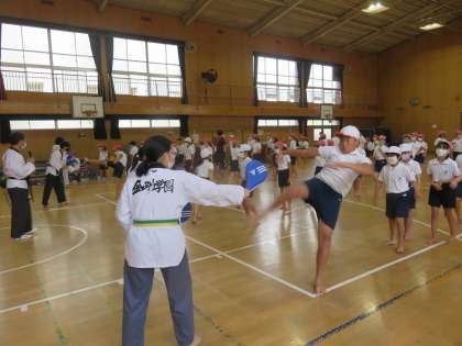 柔軟体操をしっかりしたあと、手で突いたり、足でけったりする技を実際に教えてもらいました。