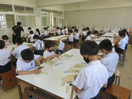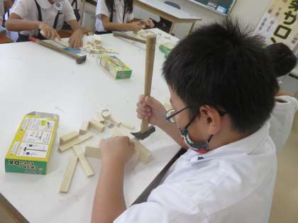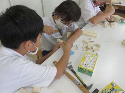 友だちに手伝ってもらいながら一緒に作っている子がいました。一生懸命打った釘を抜いている子もいました。