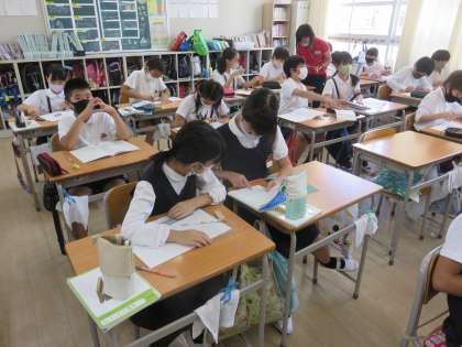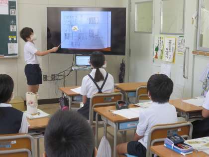 自分のノートが電子黒板に写され、子どもたちが説明をしていました。