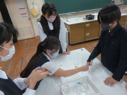 グループで考えて実験を進めていましたが、水道水の塩素が影響したり、水で洗ってもちょっとでも前の液が残っていると、微妙にリトマス紙の色が変わっていまいます。