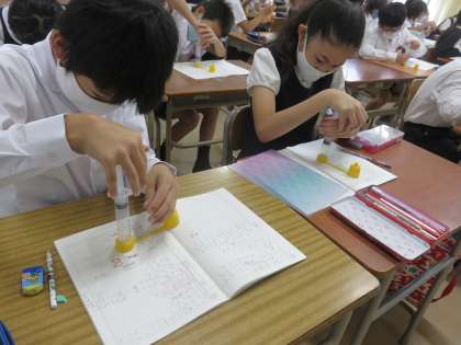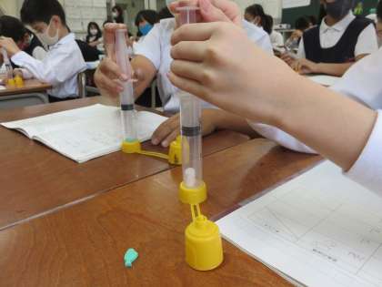 注射器の中にマシュマロなどを入れて、その大きさが変化する様子を、何回も注射器を押して確かめていました。