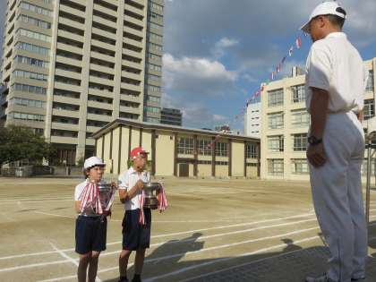 昨年は、赤白同点優勝だったので、今年は赤も白も優勝のトロフィーを返還することになりました。