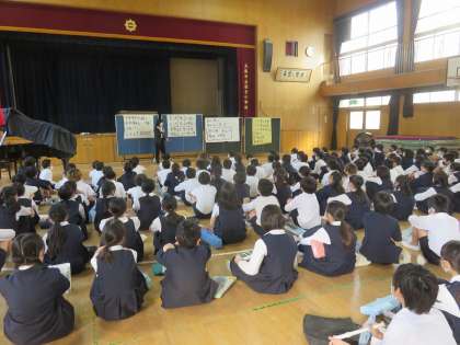 5年生が『音楽集会』で、2年生と一緒に歌う“ルパン三世”のテーマ曲の練習を講堂でしていました。