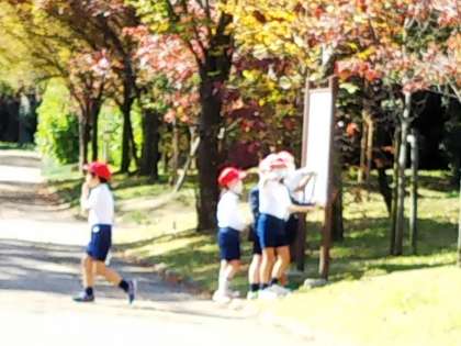 オリエンテーリングは、漢字チャレンジ、算チャレンジ、秋の草花木を見つけようです。各班ごとに回りチャレンジしています。