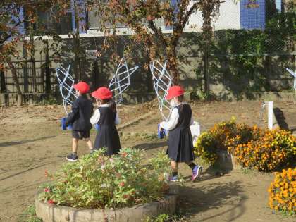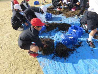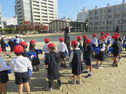 1年生が、今までアサガオを植えていた植木鉢にチューリップの球根を植えるために、土の入れ替えをしていました。
