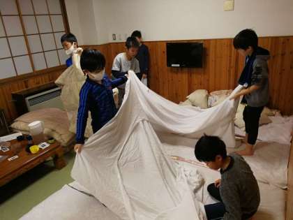 班で協力してシーツや布団をたたみ、朝の用意をします。