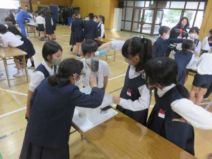 色のついた水を活性炭の中に通すと、みるみる透明になっていく様子に歓声を上げる子どもたちでした。
