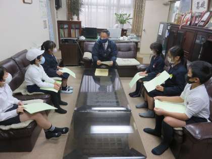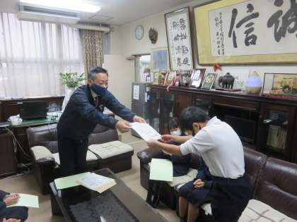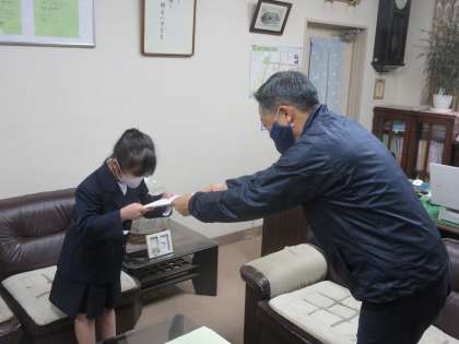 本当は、全校朝会で渡すのですが、今はできないので、校長室で渡すことになりました。