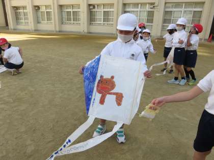 そんな中ですが、1年生の子どもたちは、元気に運動場で『凧あげ』をしていました。