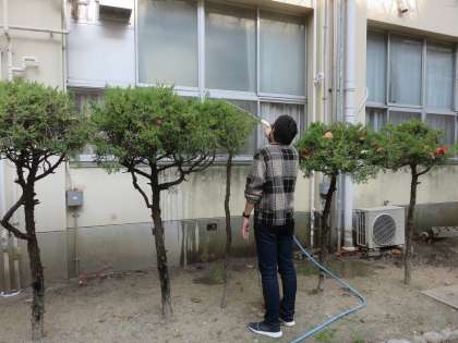 職員室もゴミを取るだけでなく、カーテンを洗濯したり、窓に水をかけて汚れを拭き取ったりしました。