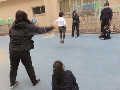 なかよし学級の子どもたちが、中庭でみんな集まって活動をしていました。