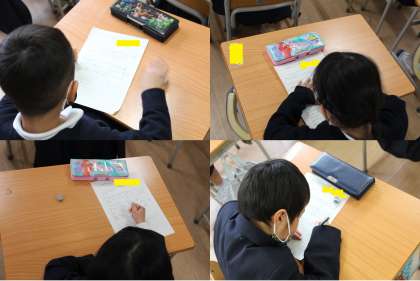 「歌をきれいな声で歌えるようにがんばった!」「毎日手を挙げて発表できた!」「お手伝いができなかったなあ。」など、2学期のふりかえりをしました。