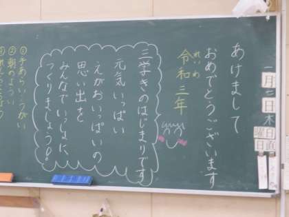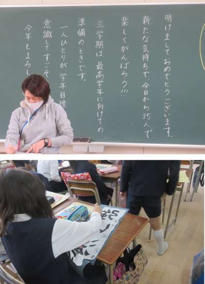各教室を回ってみると、新年の思いを黒板に書いているクラスがたくさんありました。