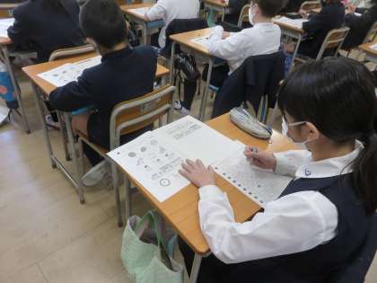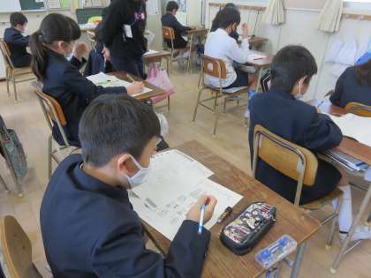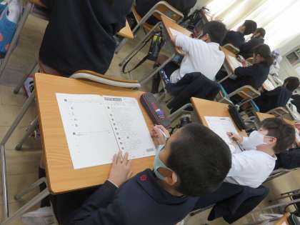 5年生の教室からも6年生の教室からも、CDに録音された英語の音声が流れ、子どもたちが解答用紙に書き込んでいました。