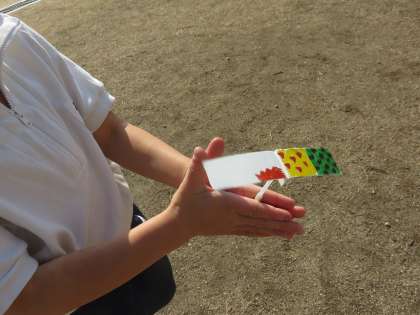 1年生が運動場で、牛乳の紙パックから作った『竹とんぼ』を飛ばしていました。