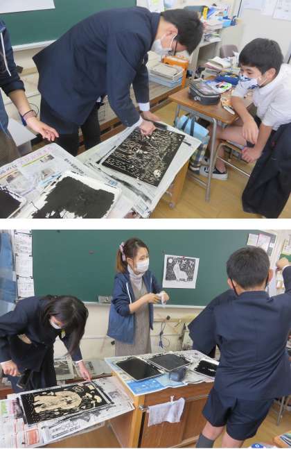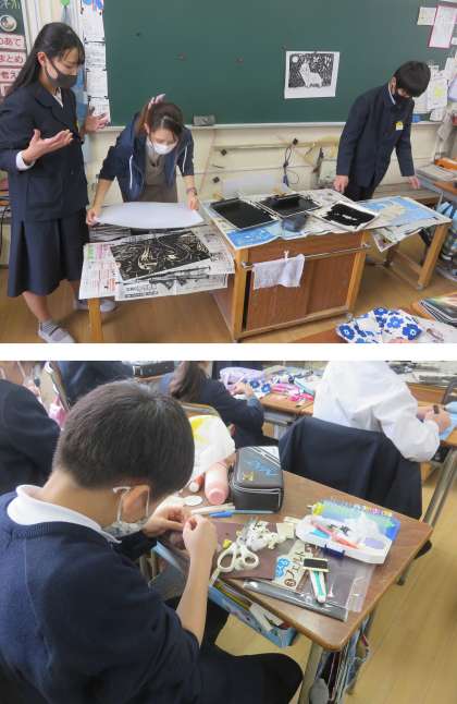 6年生の教室をのぞいてみると、教室の前で木版画を印刷していました。