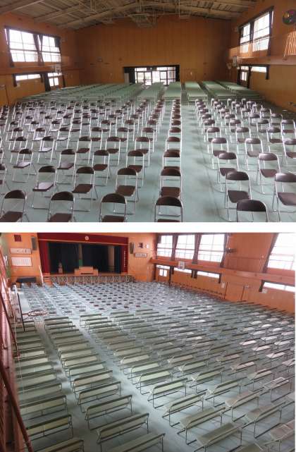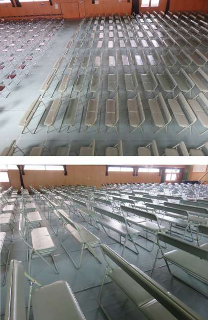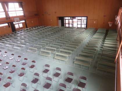 ○保護者用に、一家族一脚の長いすを用意していますが、写真を見ての通り、講堂の後ろ半分をすべて長いすで占めています。もうほとんど余裕はありません。