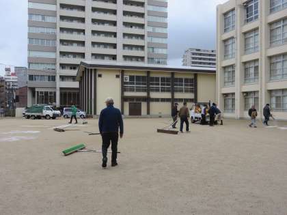 地域の人たちが朝早くから学校に来ていただき、運動場の整備をしてくださっています。