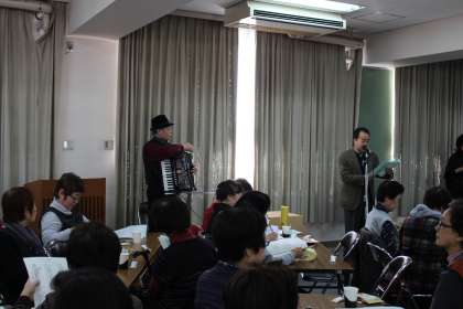 本日、日吉小学校「はぐくみネット」主催 「第6回ふれあい歌声喫茶」が行なわれました。講師に、元大阪市小学校校長、吉田育生先生をお迎えし、多目的室には100人近くの地域の方々にお越しいただきました。吉田先生の素晴らしいアコーディオン伴奏のもと、たくさんの歌を一緒に歌うことができ、あっという間に楽しい時間が過ぎていきました。ありがとうございました。