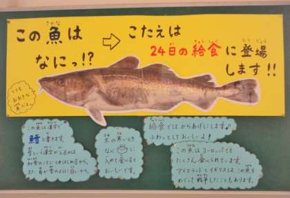 「まだら」が給食に登場するのは1年に1度、この時期です。普段は切り身で売られていることが多い「まだら」はどんな魚か子どもたちはわからなかったので、給食室前に「まだら」の写真を掲示しました。子どもたちは「大きい!」「ちょっとこわい!」と大盛り上がりでした。