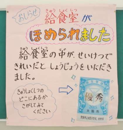 給食室の衛生管理が行き届いていて、優秀であると「優秀賞」をいただきました。これからも、安全に、そして子どもたちが安心して食べられる給食になるように、給食室一同取り組んでいきます。