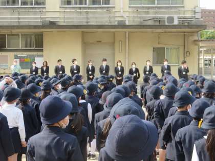 まず、運動場に2〜6年生が集まって、今年来られた教職員の先生がたを紹介する『着任式』を行いました。