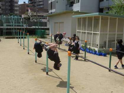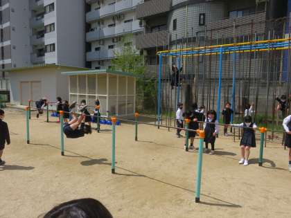 運動場では、学級写真を撮っていたので、休み時間はじゃまにならないように、2年生の子どもたちは、鉄棒やのぼり棒で遊んでいました。