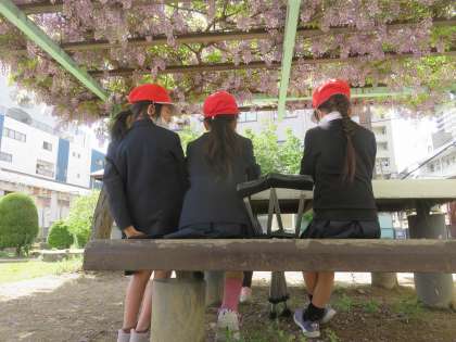 アリやダンゴムシを見つけたり、藤の花の下で、藤の花の観察をしたり藤の甘い香りをかいだり・・