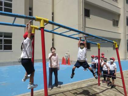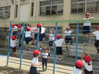 1年生の子どもたちが、中庭で遊具を使って、思い思いに運動をしていました!