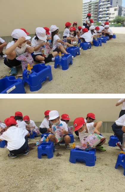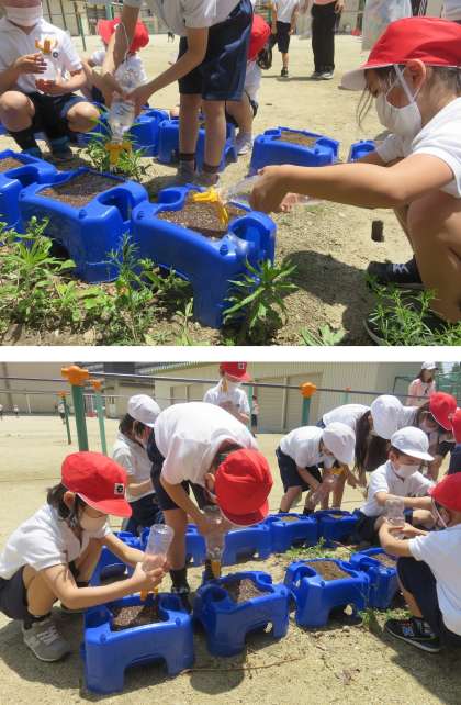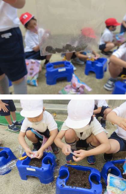 1年生が一人一鉢でアサガオの種を植えていました。