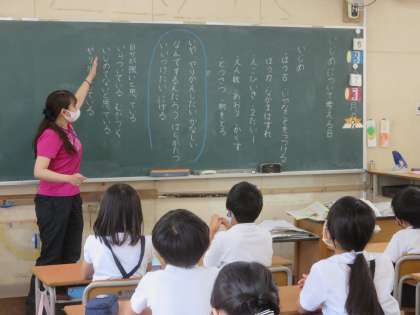 まず、Teamsの全校朝会で、金子みすゞの「こだまでしょうか」という詩を紹介しました。