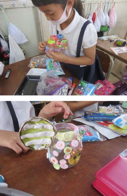よく見ると、家からリサイクルできる空き容器(プラスチックやビン・ペットボトルなど)を持ってきて、それに紙粘土を好きな色にして張り付けていました。