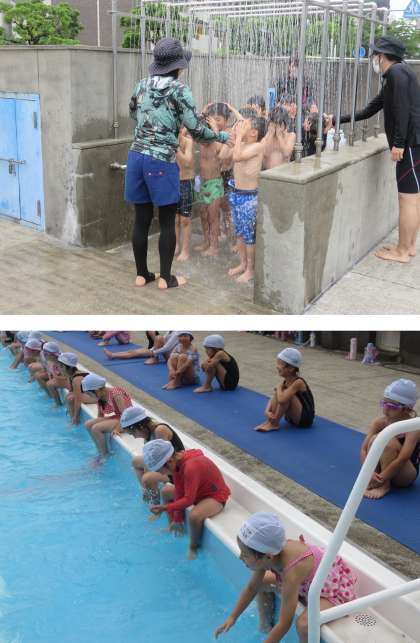 プールサイドでバタ足をしたり、頭に水をかけたりしてからプールに入りました。