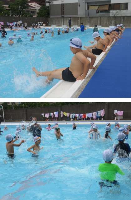 プールの中で、水に慣れたり水遊びをするのも、1年生にとっては学習の一環です。