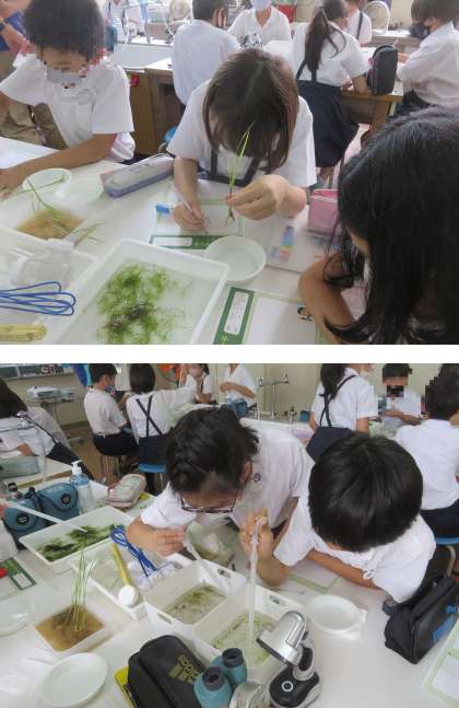 実際に田んぼに植えているイネや水を持ってきてくださり、イネの苗を絵に描いたり、ミジンコなどの生息している生き物を拡大顕微鏡を使って観察したりしました。