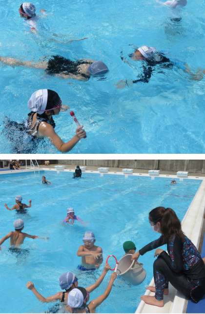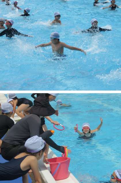1学期最後ということで、プールの最後に『宝さがし』をして、ワッカや棒などをもぐっては見つけて取っていました。