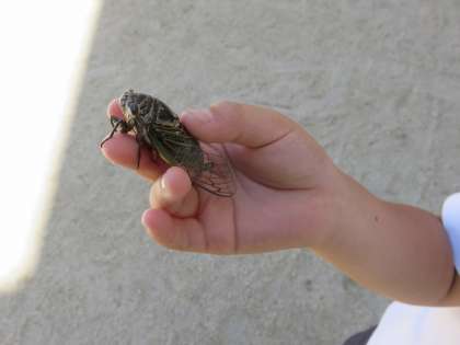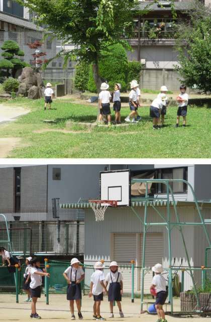 子どもたちは、木陰の下でセミを見つけたり、ドッジボールやバスケットボールをしたりしていました。