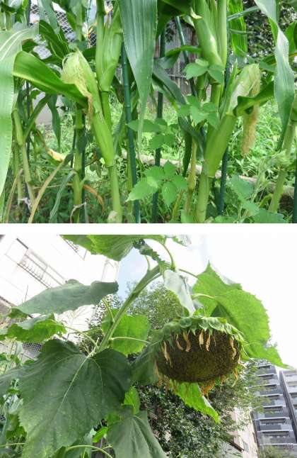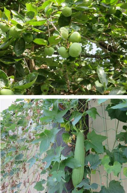 学校の学習園には、夏の花や野菜とともに、秋に向けて“柿”が青い実をつけていました。