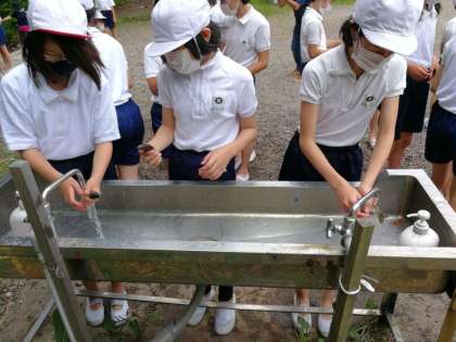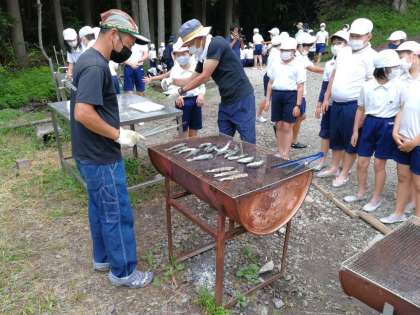 つかまえたニジマスは、すぐに洗って塩焼きにします。