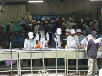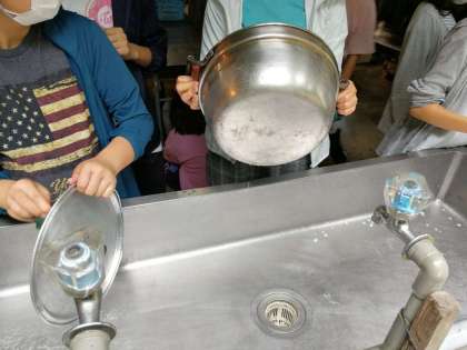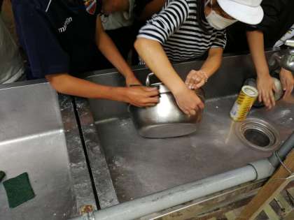 使った飯ごうやお鍋をピカピカに磨いています。