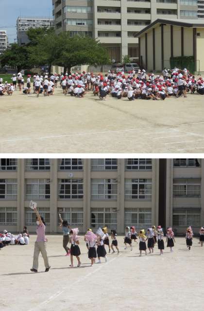 運動場で遊んでいた子どもたちは、運動場の真ん中に・・教室にいた子どもたちは、担任の先生と一緒に運動場に避難してきました。