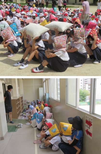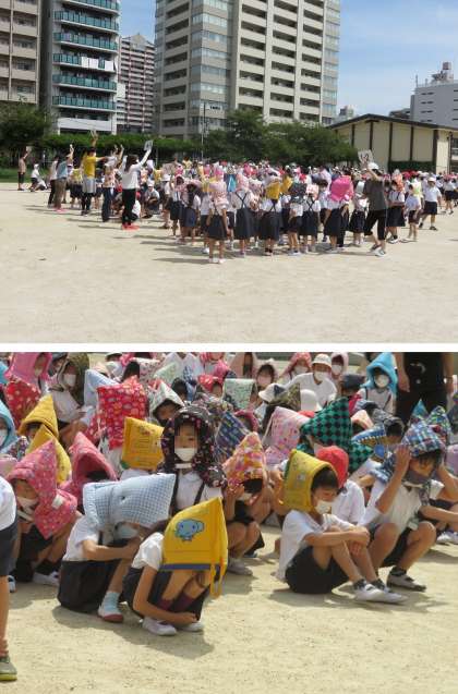 本当は、日吉幼稚園の園児たちも校庭に集まる予定だったのですが、緊急事態宣言中だったので、学校内には入らず、校門のところまで避難して、そのまま幼稚園に戻りました。