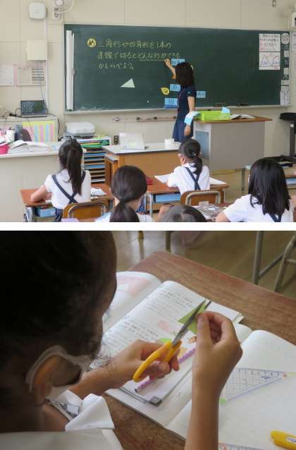 今日は三角形を切ったらどんな形になるか考える勉強でした。
