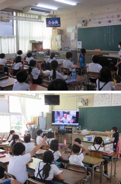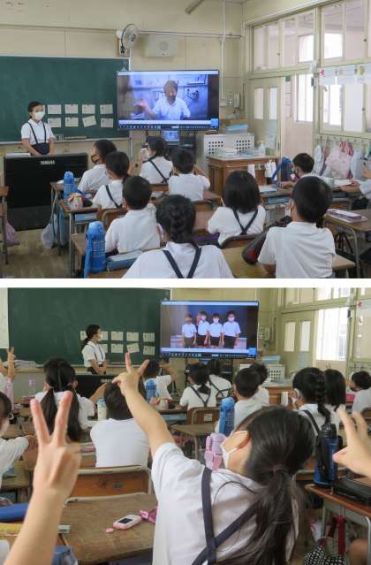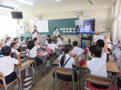 集会委員の子どもたちが前もって収録しておいたビデオを、クラスごとに教室で見て、答えました。