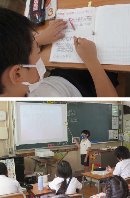 図や絵を使って何脚いるかノートに考えをまとめていましたが、どの子も自分なりの考えを自分なりの言葉で、友だちに分かってもらおうとしていたのが、とても素晴らしかったです。