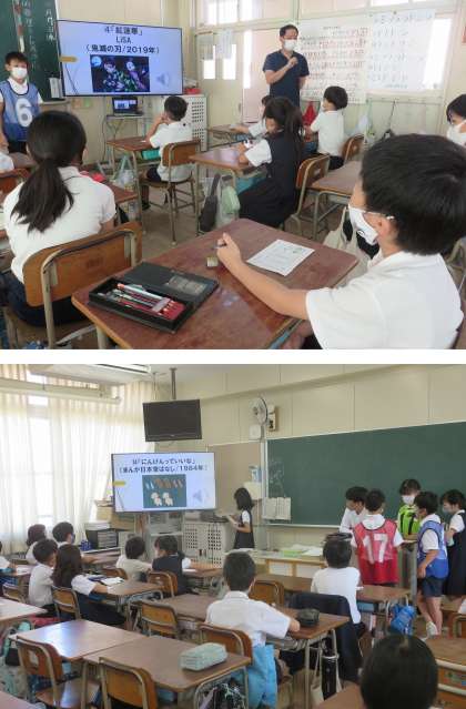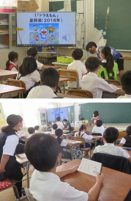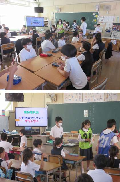 今日の児童集会は、先生方が選んだアニメソング15曲から、子どもたちが給食時間に聞きたい曲を選びました。