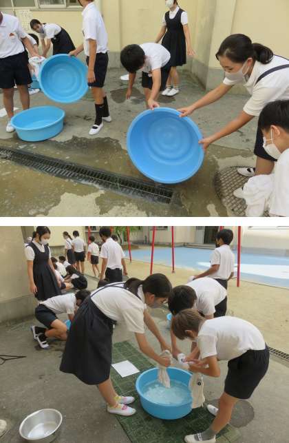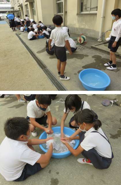 今日6年生が、運動会の練習で汚れた体操服を、たらいを使って洗濯していました。
